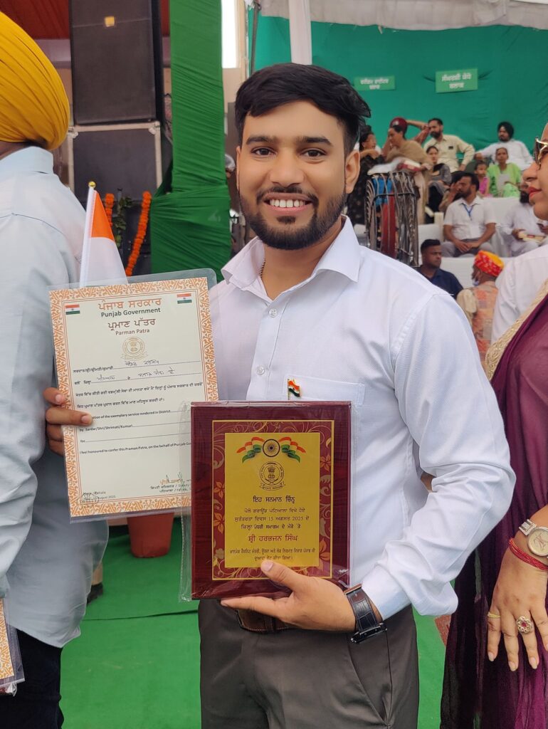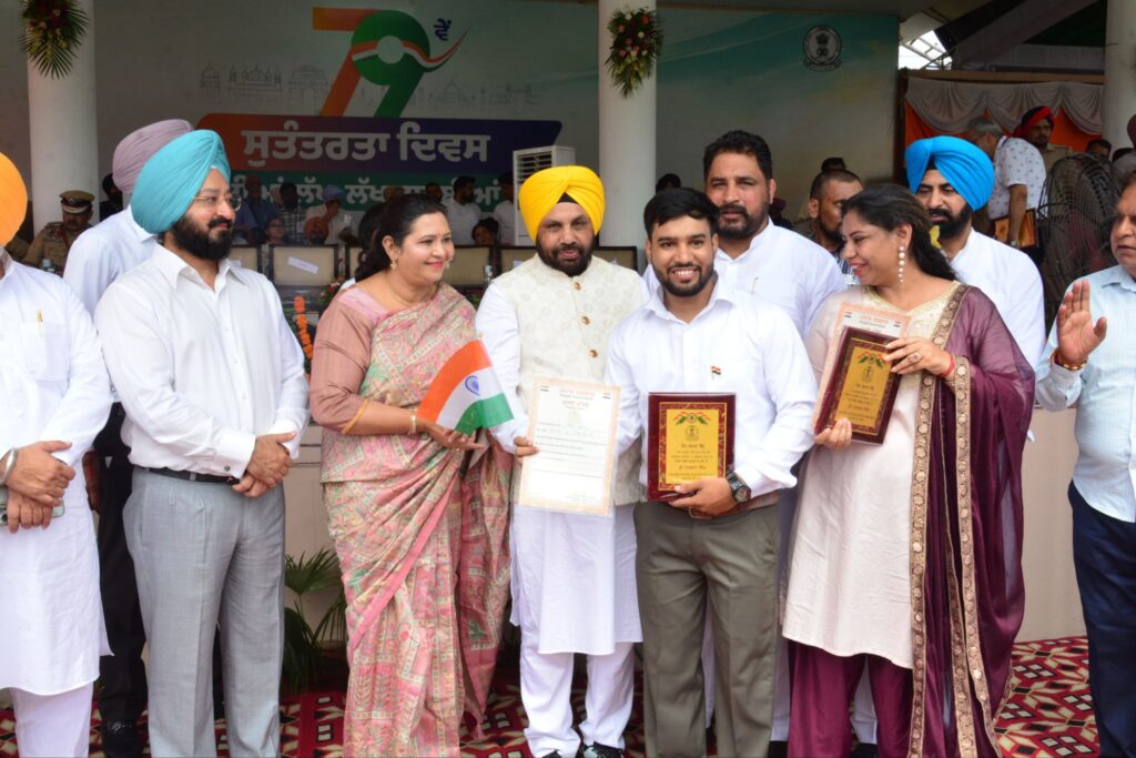 15 ਅਗਸਤ ਨੂੰ ਪੋਲੋ ਗਰਾਉਂਡ ਪਟਿਆਲਾ ਵਿਚ ਹੋਏ ਆਜ਼ਾਦੀ ਦਿਵਸ ਪ੍ਰੋਗਰਾਮ ਵਿੱਚ ਮੁੱਖ ਮਹਿਮਾਨ ਵਜੋਂ ਪੁੱਜੇ ਹਰਭਜਨ ਸਿੰਘ ਈ.ਟੀ.ਓ, ਕੈਬਿਨੇਟ ਮੰਤਰੀ ਊਰਜਾ ਤੇ ਲੋਕਨਿਰਮਾਣ ਵਿਭਾਗ ਪੰਜਾਬ ਵਲੋਂ ਪਰਮਾਣ ਪੱਤਰ ਭੇਟ ਕੀਤਾ ਗਿਆ।